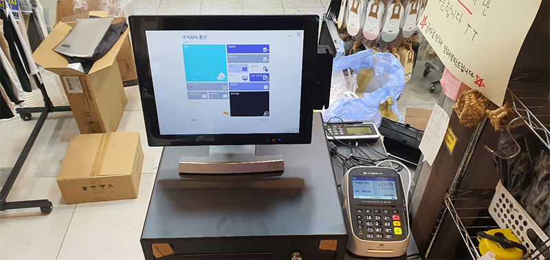 시스템구성 : 포스기 + IC리더기 + 금전함 + KIS-1420 + 서명패드 + 용지50롤 1BOX